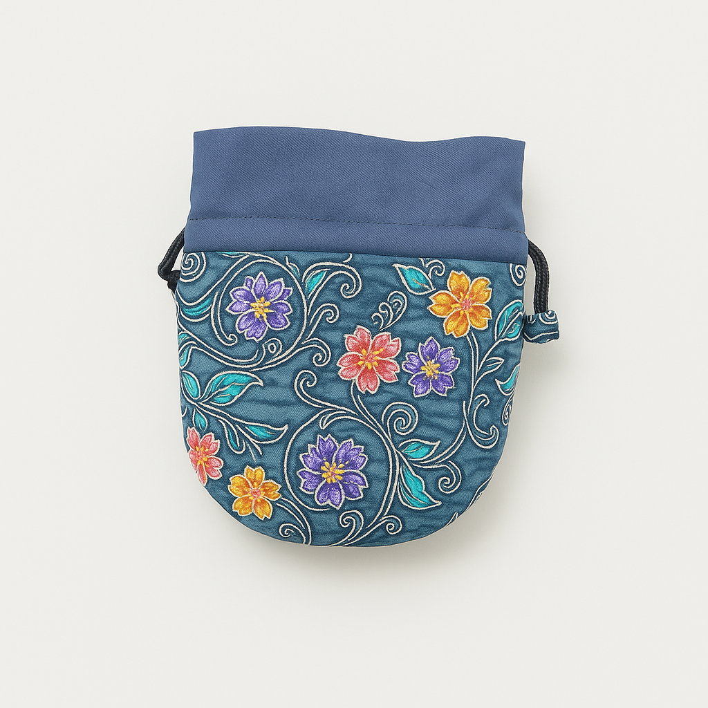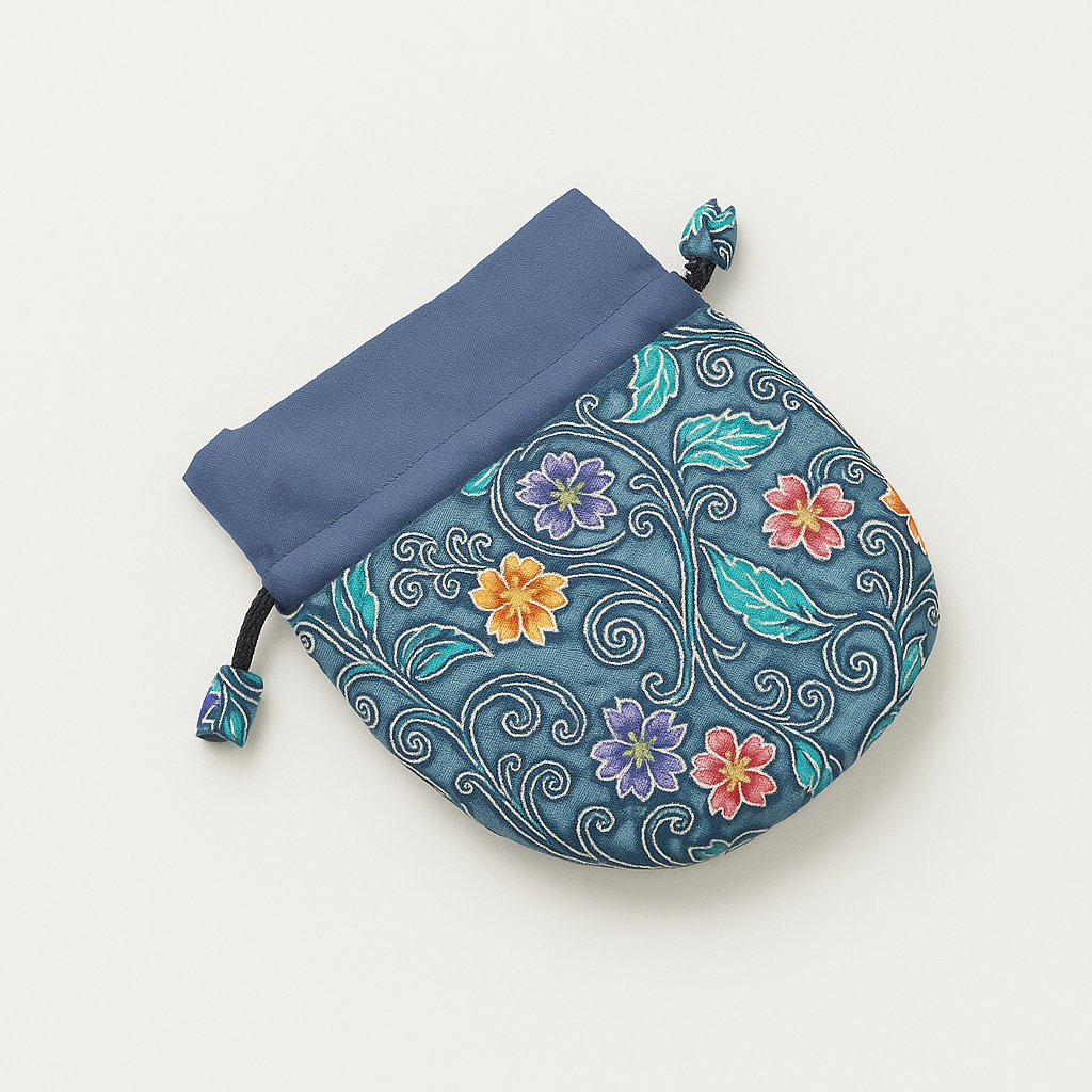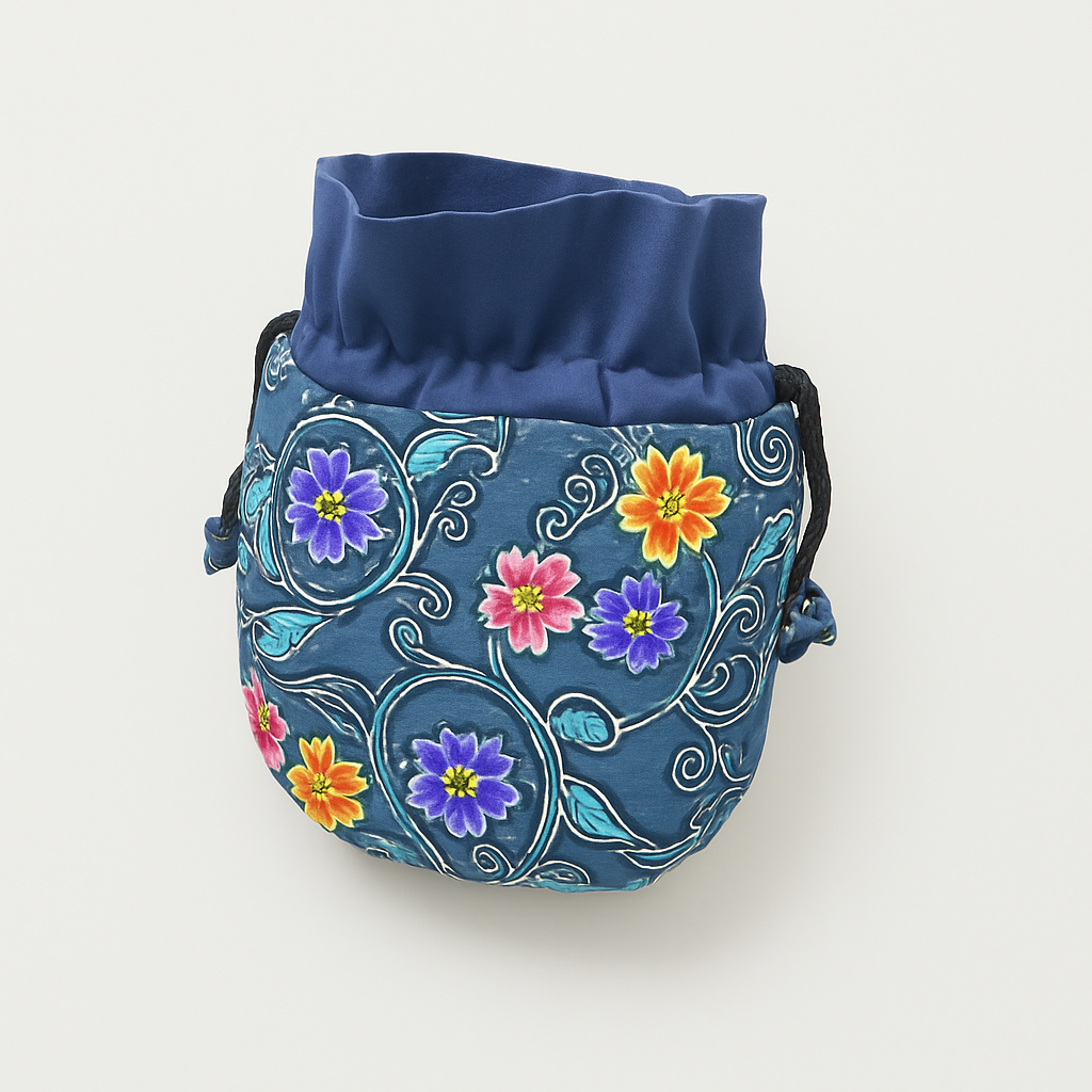 Our Batik Drawstring Pouch - Blue Floral will keep your necessities in style. This pouch is handcrafted out of high-quality cotton material with a beautiful blue batik print design with colorful flower motifs on purple, pink and yellow. The navy drawstring with a soft closure keeps your things safe, so it is ideal to use to store jewelry, cosmetics, small gadgets or travel accessories.